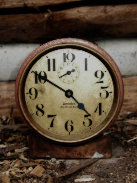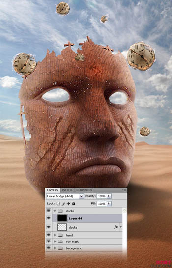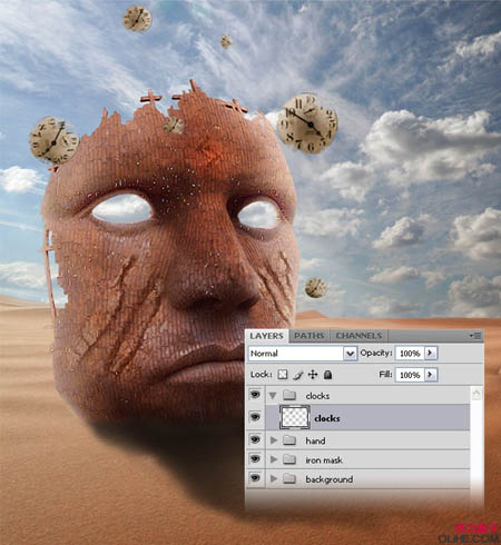 24、创建一个新组,命名为“时钟”。然后下载 download this image,并在Photoshop中打开它。使用钢笔工具(P)分离出时钟。然后使用移动工具(V)把它移到第一个文档里。去编辑>自由变换(Ctrl + T),按住Shift键并调整图象。然后用橡皮擦工具(E)擦除时钟的一些区域。