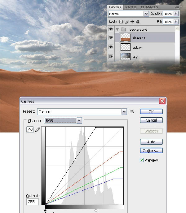3、下载这个沙漠照片desert stock photo,并在Photoshop中打开它。双击背景层解除锁定,然后使用魔术棒工具(W)来选择天空并将其删除。使用移动工具(V)把它移动到你的第一个文件里。按Ctrl + M打开曲线窗口,使用下图的设置。命名此层为“沙漠1”。