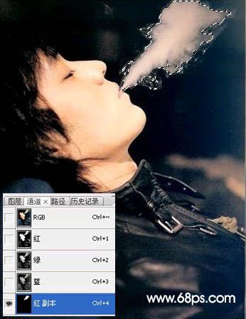 3、打开人物素材2,点开通道,将红色通道复制一层得到红副本,调整一下亮度对比度,用黑色画笔涂抹掉不需要的部分,只留下烟圈部分。然后按ctrl的同时鼠标点击红副本,回到RGB图层,得到效果如图: