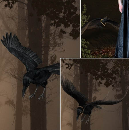 19、创建一个新涂层,画出黑鸟的翅膀和宝石项链,如图所示。对另外的鸟也是如此。使用圆形笔刷,柔化边缘。
