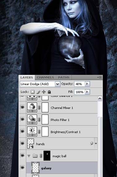 Brushes画笔,创建新图层,使用画笔工具设置前景色为白色创建一些光线在魔术球里面,然后把图层模式改变为线性减淡不透明度调整到40%,命名为galaxy,最终效果。