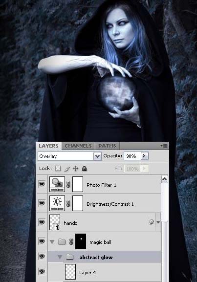 Glow 画笔,创建一个新的组命名为abstract glow,设置前景色为白色。用画笔描绘魔术球直到你想要的效果,然后组的模式调整为叠加,不透明度调整到90%,效果如下。