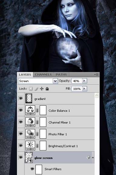 ball然后复制,然后在这个组上面右击转换为智慧对象放到hands图层上面,然后执行高斯模糊半径设置为8px,设置模式为滤色,不透明度为40%,命名为glow