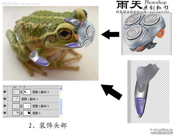 2、开始装饰头部:把胡须刀的顶部部分用套索工具抠出来,然后复制进来,贴到青蛙的嘴部位置,适当的变形处理,同样的方法勾出下图右下图形放到青蛙的嘴部边缘,效果如下图。