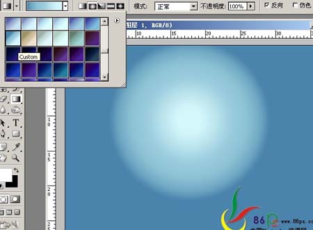 2、新建图层,选择渐变工具,用这个渐变在画布上半部拉出一个径向渐变。
