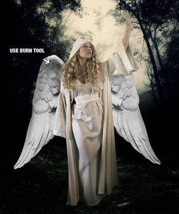 10、创造天使导入翅膀图象,使用钢笔工具(P)选择轮廓,去掉图像中黑色的部分。然后在翅膀顶端使用加深工具(O)。