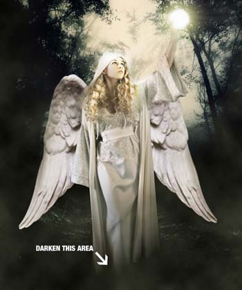 19、现在创建一个新层,把它放在云层下面,添加一些阴影。用黑色笔刷在天使的腿和衣服周围涂抹。