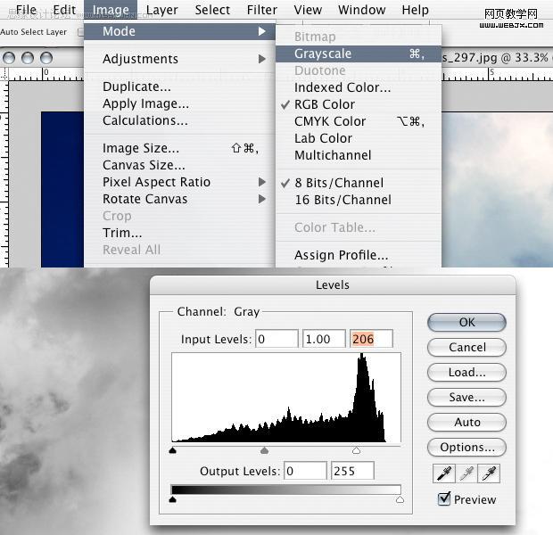 2、调整图像模式为灰度,然后按CTRL+I反相,之后用CTRL+L调整色阶,效果如下。