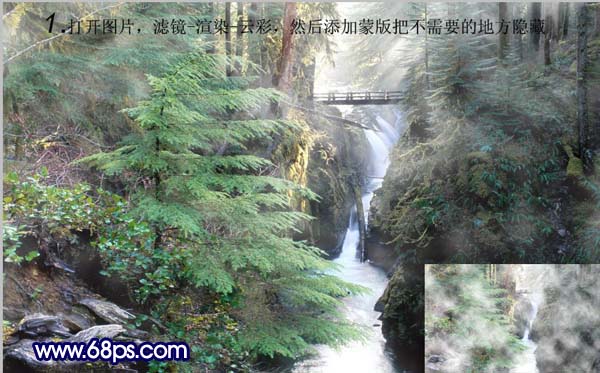 > 渲染 > 云彩,确定后把图层混合模式改为“滤色”,添加图层蒙版用黑色画笔把需要的地方擦掉。