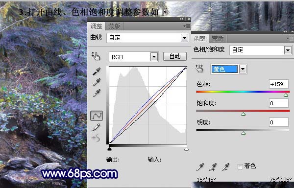 3、创建创建曲线调整图层,对RGB及蓝色进行调整,参数设置如下图,确定后再创建色相/饱和度调整图层,参数设置如下图。