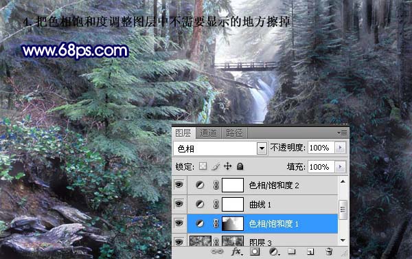 4、把色相/饱和度调整图层中不需要显示的地方擦掉。