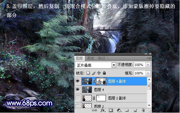 + Alt + Shift + E盖印图层,把盖印后的图层复制一层,图层混合模式改为“正片叠底”,添加图层蒙版用黑色画笔擦掉不需要的部位。