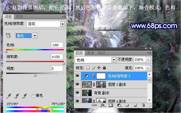 + Shift + ] 置顶,然后创建色相/饱和度调整图层,参数设置如下图,确定后把图层混合模式改为“色相”。