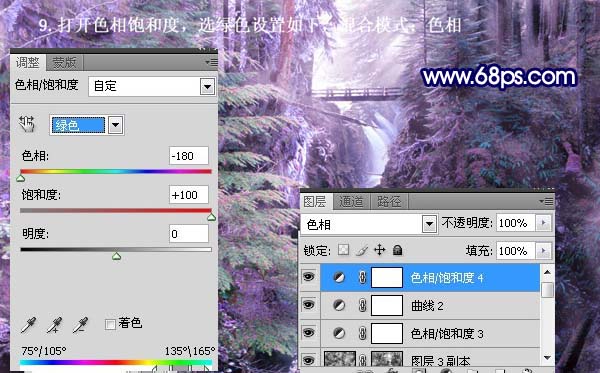 9、创建色相/饱和度调整图层,对绿色进行调整,参数设置如下图,确定后把图层混合模式改为“色相”。