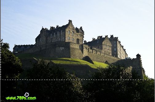 10、然后按CTRL+C复制城堡选区,回到我们的背景文档上按CTRL+V粘贴进去,模式改为强光。