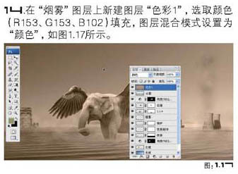 14、在烟雾图层上新建图层色彩1,选区颜色(R:153,G:153,B:102)填充,图层混合模式改为“颜色”。