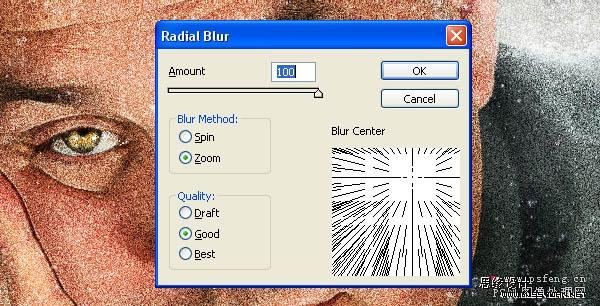 27、然后再执行滤镜/模糊/径向模糊。模糊中心为右肩。