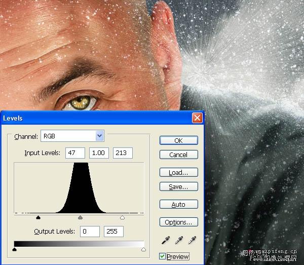 28、调整放射效果的位置,并设置图层混合模式为叠加。然后用色阶增强其对比。