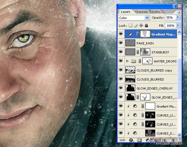 36、在顶层创建一个新阈值调整层,混合模式设为颜色,不透明度设为55%。然后用软画笔在蒙板里对人物脸部进行细节处理。