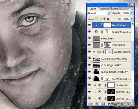 37、在顶层添加一个色相/饱和度调整层。降低饱和度到-68%。