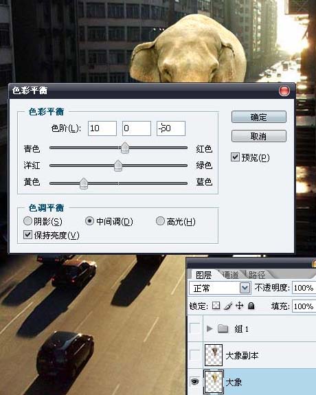 2、隐藏大象副本图层,先来制作阳光照耀在大象身上的颜色,执行:图像——调整——亮度和对比度。