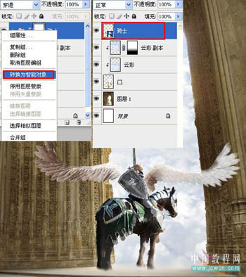 22、现在我们来给“骑士”组添加阴影,右键点击“骑士”组,转换为智能对象,此时在图层面板上“骑士”组变为一个图层智能对象图层,如果你想对“骑士”组进行编辑,可以双击智能对象层,会出现一个新的文件,编辑完成保存(不是另存为),新的改动将应用于智能对象。
