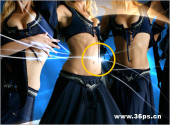 16、添加光点。选用一个17像素的画笔,在中间线条处画一个白色光点。为这个光点添加外发光的混合模式。图层样式---外发光,外发光模式设置为线性减淡,不透明度100%,颜色#008AFF,大小为24像素,其他设置保持不变。确定。