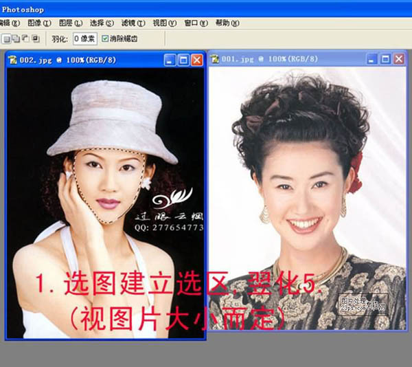1、打开原图,用索套或其它选择工具在原图上勾出人物的基本脸形,建立选区,适当羽化。