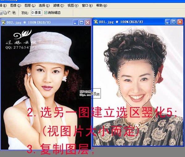 2、选择素材图片,同样勾出她的脸形,适当羽化;Ctrl+J将选区内的脸复制出来,Ctrl+A全选,Ctrl+C复制这一图层。