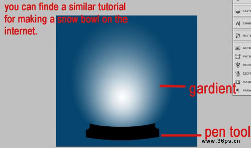 1、教程开始先制作一个下雪的玻璃水晶球。制作方法如下图,制作黑色的地盘,然后新建一个图层用椭圆选框工具拉一个合适的正圆拉上径向渐变,颜色请参照下图。