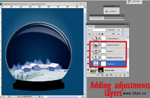 5、对房子图层进行调色,大致调成蓝白色,有种雪花覆盖的感觉。