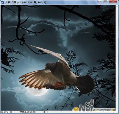 5、打开素材图片【鹰】,虽然图像有些模糊,但是在本例中正好可以渲染出一种鬼魅的气氛。使用【魔棒工具】将背景选择出来,按【Ctrl+Shift+I】键将选区翻转,然后按【Ctrl+J】键复制选区中的图像,得到【图层1】。使用【移动工具】将【图层1】拖入到【月夜飞翔】中,并将其命名为【鹰】。效果如下图所示。