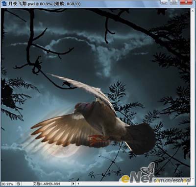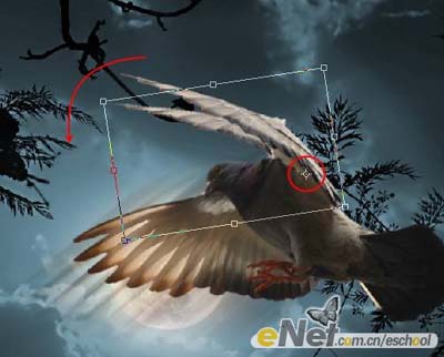 副本】。将【翅膀2】图层移动到图层【鹰】的下面,按【Ctrl+T】键进入自由变换模式,将“中心点”拖到翅膀与身体的接合处,然后旋转图像,效果如下图所示。