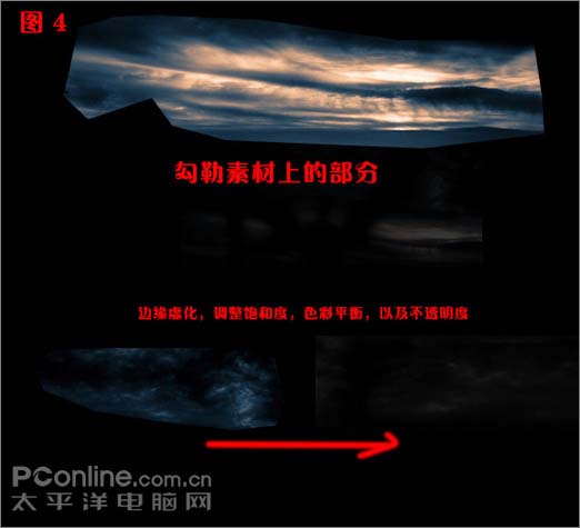 5、背景的制作。打开素材2,用“多边形索套工具”勾勒出晚霞的部分,放到“人物”和“翅膀”的下面,然后执行菜单—图像—调整,降低饱和度,再降低一下不透明度和色彩平衡,然后进入蒙版,将边缘的棱角进行虚化处理。营造出“混沌场面”的效果,大家可以想像一下《魔间行者》中的场景。如图