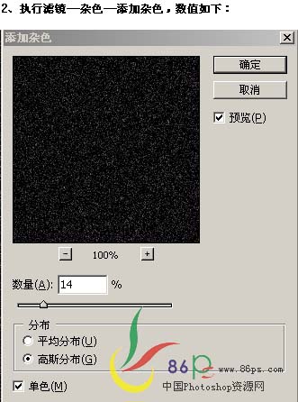 2、执行菜单:滤镜 > 杂色 > 添加杂色,参数设置如下图。