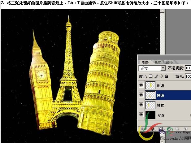 7、将三张出来好的图片拖到背景上,分别按Ctrl + T自由旋转和变形,大致效果如下图。