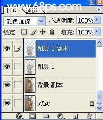 2、按Ctrl + J把刚才的纹理图层复制一层,然后把图层混合模式改为“颜色加深”,效果如图5