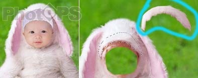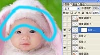 2、找张草地的素材把勾好的宝宝放进来,再抠下自己宝宝的头,要抠整个头部,不要脖子,特别是脸的外轮廓一定要抠光滑.调整头的大小放与兔子宝宝图上.(如图)沿头套部分轮廓扣出,拷贝个图层,抠出的部分如图右上蓝色框住的部分。