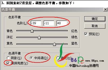 3、回到素材2背景层,调整色彩平衡,参数设置如下图。