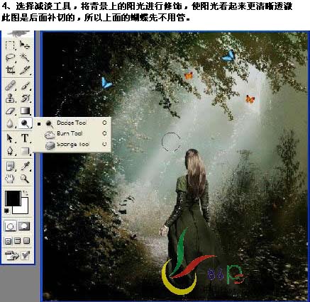 4、选择减淡工具,将背景上的阳光进行修饰,使阳光看起来更清晰透彻。