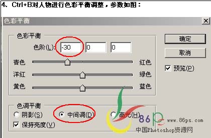 + B对人物条则很难干色彩平衡,参数设置如下图。
