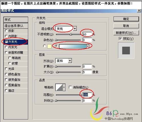 新建一个图层,在图片上点出画笔效果,然后双击图层调出图层样式,选择外发光,参数设置如下图。