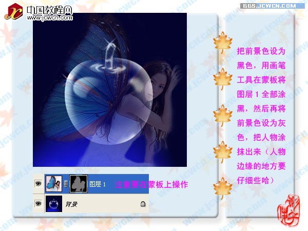 3.把前景颜色设置为黑色,用画笔工具在蒙版将图层1全部涂黑,然后再将前景色设置为灰色把人物涂出来