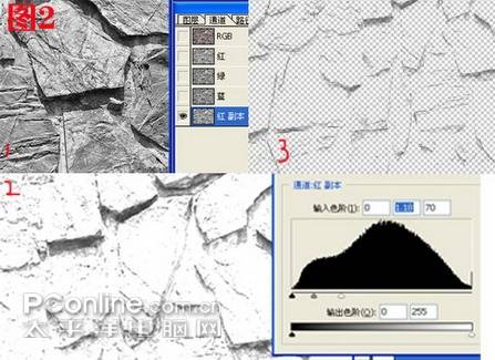 B:在背景层之上人物层之下新建一层命名“纹理层”。打开素材1,复制粘贴到纹理层,关闭其他两个层(点图层前的眼睛)。当前在纹理层,进通道—复制红通道,然后菜单—图象—调整—色阶,调整为图2示例效果,按住CTRL点“红通道副本”之后回到图层,点纹理层,按下DELETE,删除多余部分得到图2中的3。如图2。