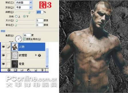 C:打开人物层和背景层,双击“纹理层”调整混合模式,选斜面浮雕,内斜面,平滑,深度710%