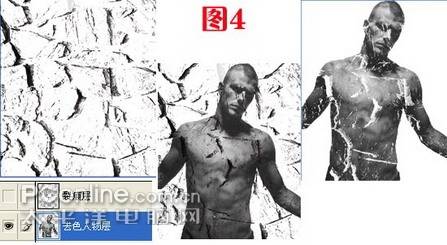 B:制作人物裂痕层。这里还要用到素材1。用上面制作背景纹理的方法得到裂痕,CTRL+裂痕层使之浮动,回到已经去色的人物层,CTRL+X删除,关闭裂痕层。这样就得到裂纹的人物。如图4。