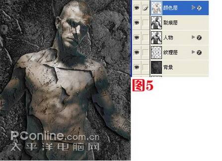 C:人物裂痕层和人物主体层一叠加就得到身上到处是裂痕的小贝。加强一下裂痕的效果,双击裂痕层,调整混合模式的投影,内阴影,数值自由设置,只要裂痕看上去比较清晰即可。然后将裂痕层的不透明度调整为75%,之后将刚才备用的彩色人物图层复制一层,移动到裂痕层之上,将图层属性设置为颜色,来加强颜色。为了使人物看上去比较立体,应该把颜色、裂痕、主体进行投影,具体数值自由可设定。做的到这一步骤时,图层顺序应该是图5所示的。如图5。