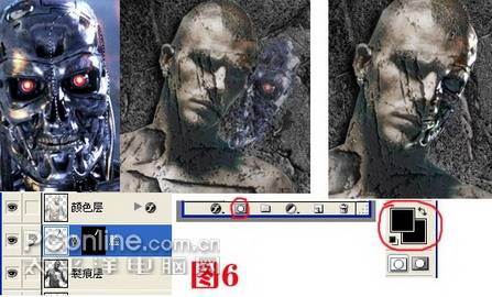 看过《终结者》系列电影的都知道,战斗中损坏皮肤后会露出金属的骨架,我们来为小贝合成个金属骨架。这里用到了“移花接木”的拼接,类似上期教程中的衣服合成。首先打开“素材4”多边型工具勾勒出机器人的半边脸,复制、粘贴到“颜色层”之下,将此层命名为“脸”,CTRL+T进行大小上的调整,之后把本层的不透明度调整为50,仔细的和小贝的脸进行匹配,然后按住CTRL点“脸”层使之浮动,给其创建蒙板,设置前后景色均为黑色,用画笔工具檫掉多余的部分,之后恢复不透明度为90%。虽然勾勒过来的机器脸是冰蓝色的,但因为是在“颜色层”之下,所以不用进行颜色调整。如图6。