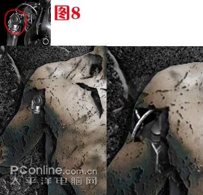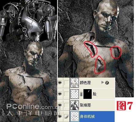 打开“素材3”多边型工具勾勒出部分机器骨架,粘贴到人物裂痕层之下,命名为“身体机械”。然后按住CTRL+人物裂痕层使之浮起,在回到“身体机械层”CTRL+X删除多余部分这样在身体的裂痕处就能看到体内的机械。如图7。