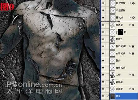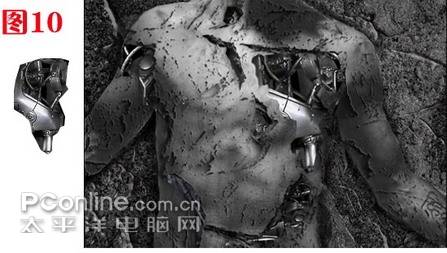 B:从素材3上勾勒出一半机械胸部分,粘贴到“人物裂痕层”之下,命名为“胸口机械”,CTRL+T调整大小(为了制作起来方便,建议关掉颜色层),之后CTRL+本层使之浮动,回到“人物裂痕层”剪切掉一部分露出这机械。如图10。